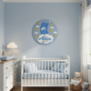 Această placă rotundă din lemn premium este gravată și decupată laser cu precizie, design layered: elefant înger albastru cu aripi albe, stele galbene și nori albi pe fundal gri-albastru. Personalizare completă cu datele bebelușului – cadou emoționant pentru părinți, bunici sau botez